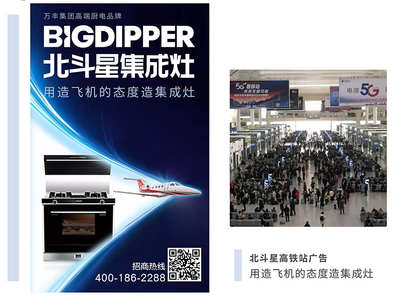 在品牌林立的高鐵站,每天數以千萬級的高端客流量,無論在候車大廳、檢票口等黃金高客流量區域,都能發現北斗星集成灶的廣告。這必將大幅提升北斗星品牌的曝光度與知名度,同時也進一步將“用造飛機的態度造集成灶”的品牌精工理念傳遞給更多的消費者!