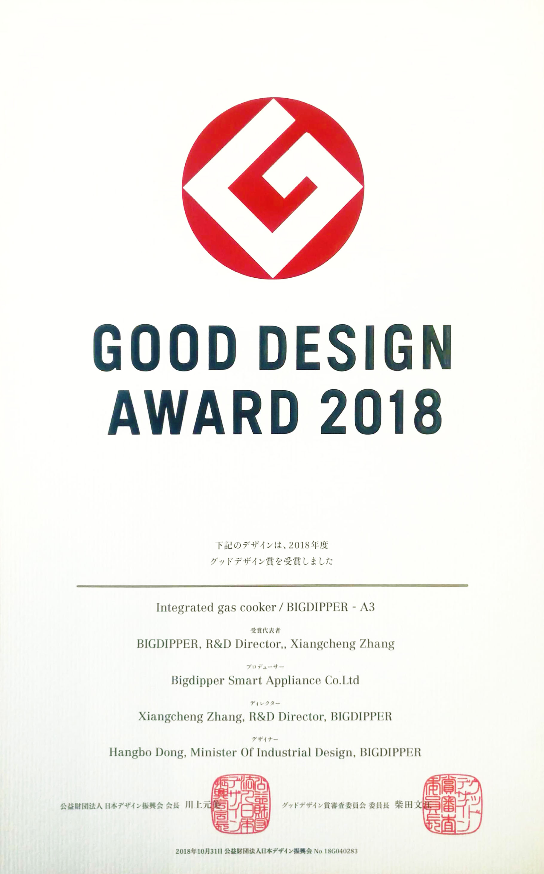 北斗星榮獲全球四大工業設計獎項之一的國際“G-Mark設計獎”,成為集成灶行業首個獲此殊榮的品牌,G-Mark素有“東方設計奧斯卡獎”之稱。
