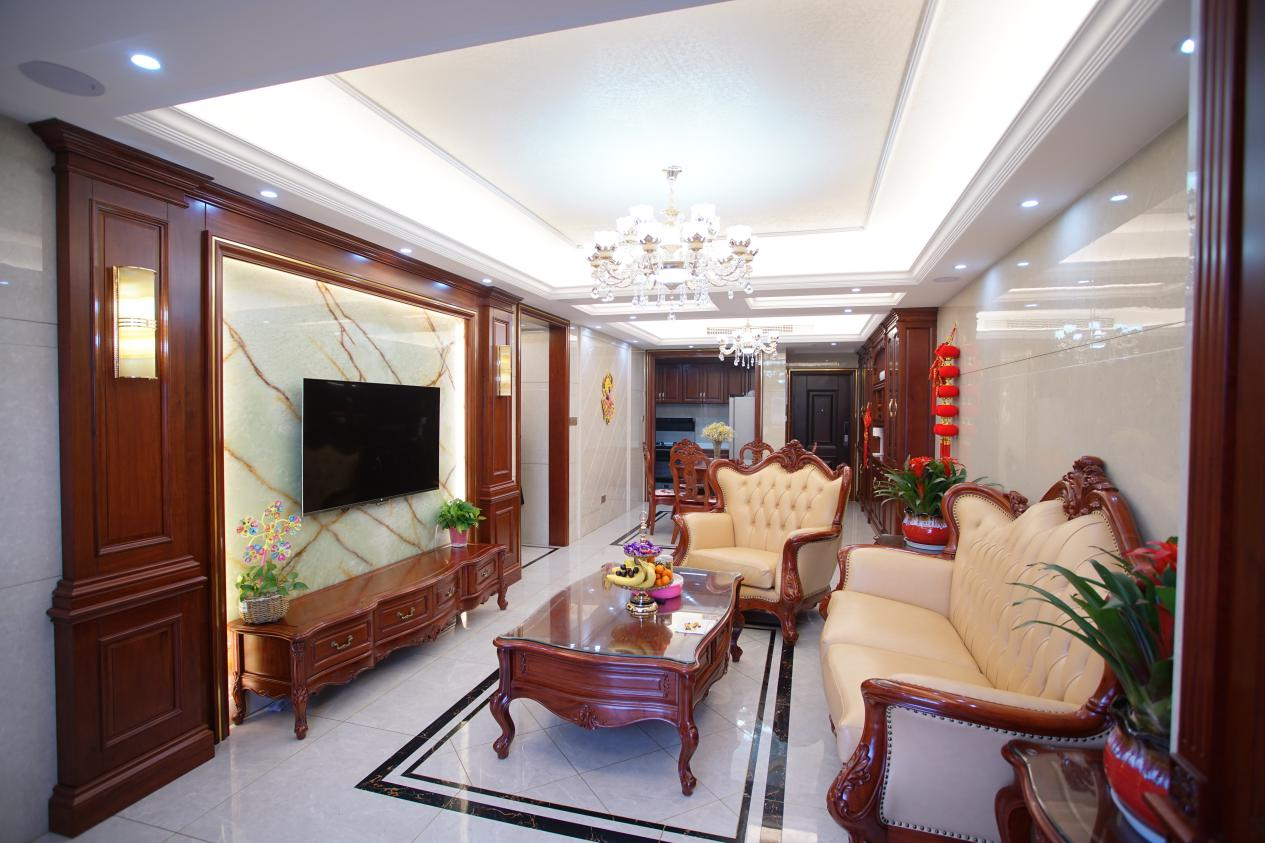 新中式客廳優(yōu)雅而有氣質(zhì),將古典元素和現(xiàn)代元素相結(jié)合起來, 營造出一種復(fù)古清新的意境感。設(shè)計(jì)以“簡”為道, 通過對材質(zhì)、色彩、造型、氛圍等細(xì)節(jié)的著重拿捏,營造出富有品質(zhì)感的居住環(huán)境。新中式客廳家具形態(tài)上更加簡潔, 用墻面淺色系、沙發(fā)、天花板吊燈裝修房間,再搭配深色色系的木地板+茶幾+電視背景墻,給人簡約大方、高貴典雅的感受。為平衡房屋整潔美觀,舍棄了繁瑣的裝飾、奢華空間裝飾,去掉零碎空間劃分,簡單而不簡約。