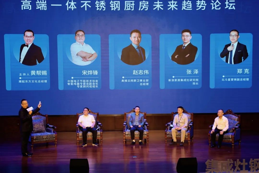 隨后,由潮起東方文化總經理黃幫賜主持的《一體不銹鋼廚房未來趨勢》論壇上,中國電子節能技術協會副會長宋燁鋒、北京奧維云網廚衛事業部總經理趙志偉、北斗星副總經理鄭克、新浪家居集成灶研究院院長張澤等各位資深行業人士,針對消費人群、需求升級、行業發展等相關現狀與未來趨勢展開深入對話。